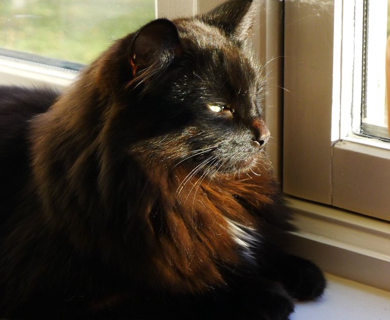 Etter å ha ropt både fra vinduet og rundt i nabolaget i nesten to døgn, ropte jeg en siste gang fra vinduet før jeg skulle legge meg i dag. Og da hørte jeg en liten sår stemme borte fra lia som svarte. Jeg ropte igjen, så kom han løpende og hoppet rett inn vinduet. Han var ikke spesielt forkommen, men litt sulten. Tror muligens han har bodd innendørs.