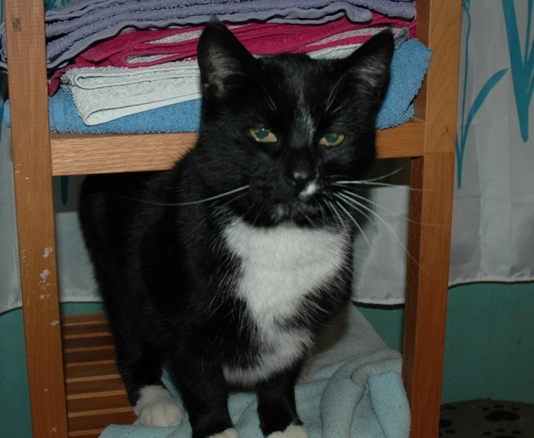 Stor hannkatt. Mest svart, hvit på brystet, hvite sokker og hvit helt ytterst på haletippen.
