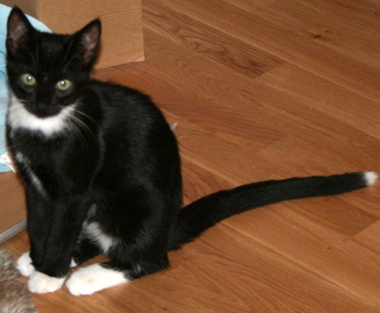 Han har korthåret sort pels med hvit haletipp, hals, mage og hvit nederst på labbene. Har noen få hvite hår mellom øynene. Han har hvite værhår over venstre øye og sorte værhår over høyre øye (som dermed vises dårlig mot den sorte pelsen).