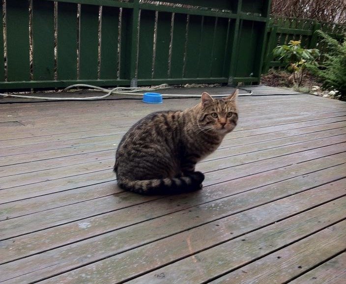 Denne katten dukket opp i Oktober 2012 hos oss. På jakt etter mat. Den har nå oppholdt seg her rundt huset mitt og hos min kjæreste sin leilighet. Der søker han også etter mat. Det ser ut som en katt som har hatt et hjem. Ser han til alle døgnets tider.