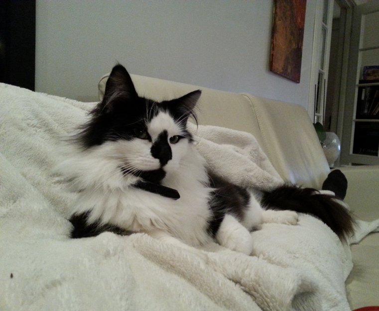 Langhåret Sort og hvit 1,5 år gammel hannkatt forsvunnet. Sist sett 31. Januar. Har hvitt ansikt med sort hake og nese. Rødt halsbånd med id brikke med navn og nummer (mulig han har fått det av). Han er velidg petit og dermed kan han let tas for å være en jentepus.