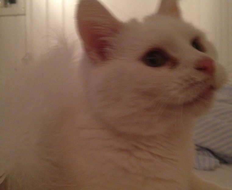 Helt hvit katt, med betennelse i øyekroken. Den ene er gul og rennende mens den andre er sort og ofte størknet