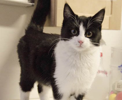 Sort rygg, hale og hode. Hvit bliss, bryst og buk, samt hvite "knestrømper". Symmetrisk mønster på begge sider. Svært tillitsfull, kosete, pratsom og leken. Ser ikke ut til å ha gått ute særlig lenge.