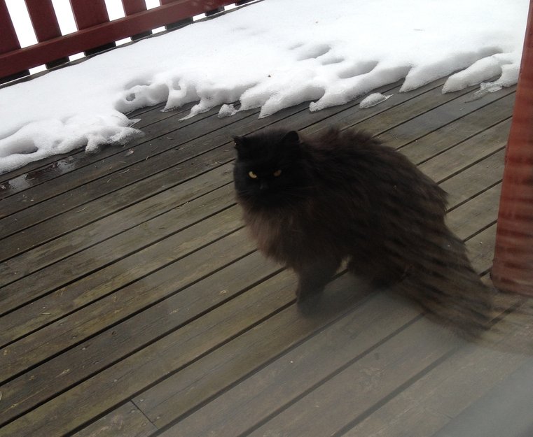 Katten har lang og fyldig pels. I hovedsak svart, men noe grålig under bryst og bakende. Øynene er ganske spesielle, tettsittende og gule. Den ser nesten litt morsk ut.