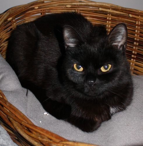 Snill, kontaktsøkende pusi. Tynn og sliten, kan ha gått ute lenge. Korthåret sort med hvit flekk i brystet, spesielt ansikt.