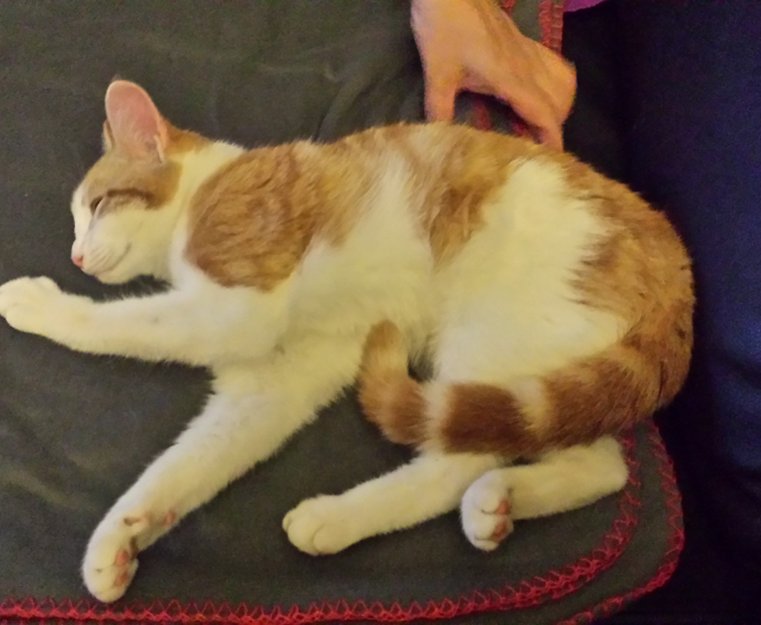 Katten ser ganske frisk og ung. Som dere ser i bildet er hun lysebrun og hvit i pelsen.