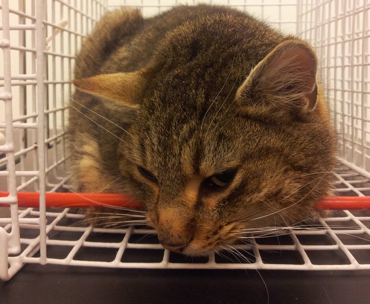 Har gått ute antagelig det meste av vinteren. Ble tatt inn av Dyrebeskyttelsen. Tynn og med betente sår. Men den er kastrert, så noen må jo savne den.
