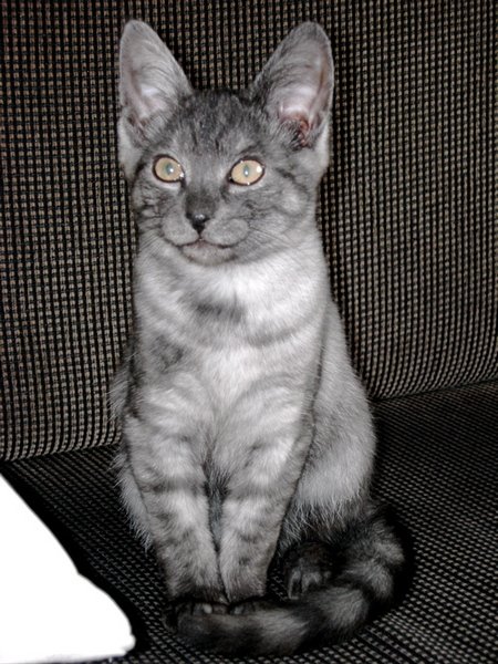 Gråsvart kattunge, spesiell i farge/mønster, tillitsfull og vant med folk.