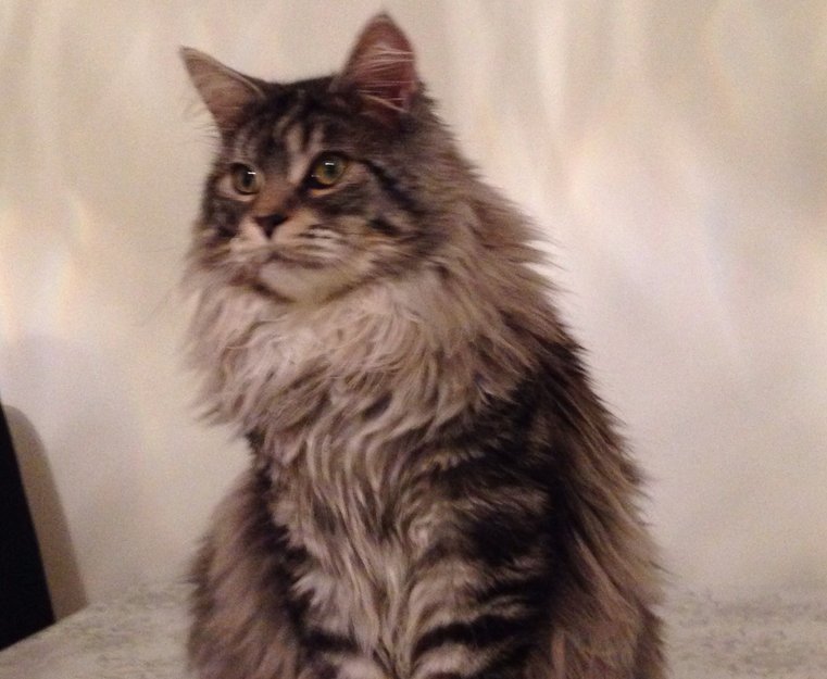 Han er sølvtabby, som i grå tigerstripet, litt svart langs ryggen. Stor hale, og litt tuster på ørene. Ganske stor katt ca 6,5 kg, store labber. Lyder navnet sitt. Chip merket og kastrert.