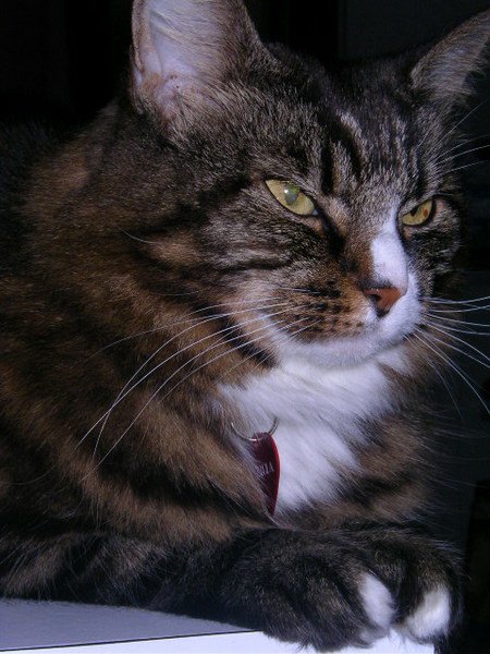 Svart/brunstripet, hvite sokker på bakbeina og "fløteflekker" på tuppen av begge forpoter.Hvit nese og hals. Grønne øyne. Litt sky