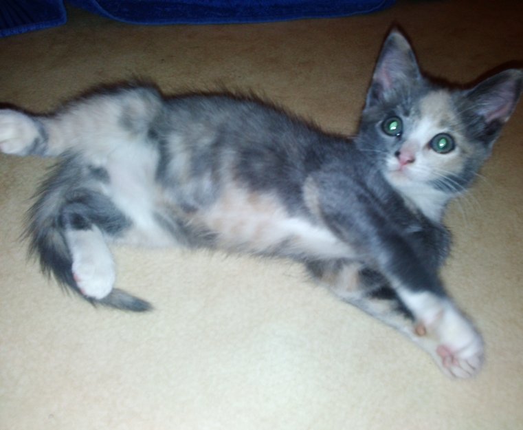 Hun er 10 måneder, er chippet og har bokstavene TYS tatovert i ene øret. Hun er litt i rundeste laget. Hun er skilpaddefarget/tricolor. Grå, oransje og hvit. Menneskekjær og veldig glad i mat. På bildet er hun bare kattungen, men det var det beste bildet jeg hadde av henne.