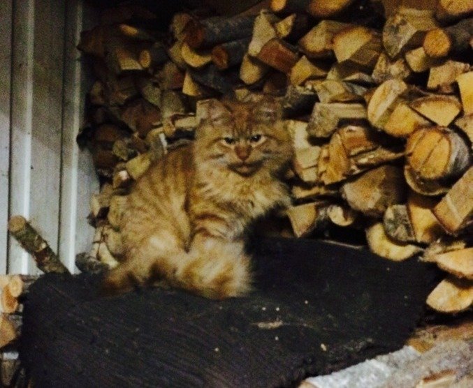 hei , denne søte hann katten har funnet veien til vår garasje på sjøskogen. Den er rød/hvit,og veldig kjælen