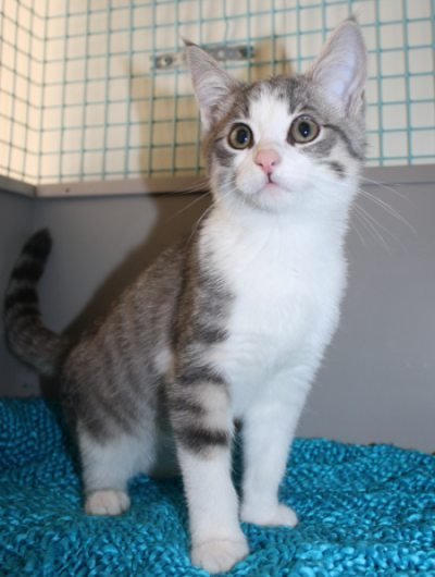 Trivelig og kos kattunge,gråstripet på rygg og hode, hvit på labber, mage og hals