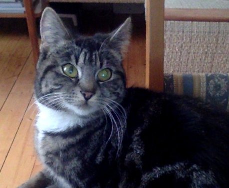 Katten har oppholdt seg i hagen fra januar. I begynnelsen var den veldig redd og gjemte seg når jeg snakket til den. Nå har den blitt trygg på meg og hopper gjerne inn av kjøkkenviduet for å få kos.