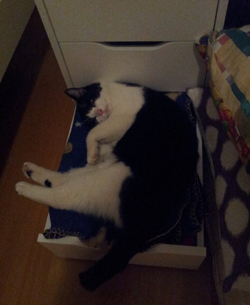 Fire hvite poter. Litt hvitt på nesen. Liten svart prikk på baksiden av høyre bakfot