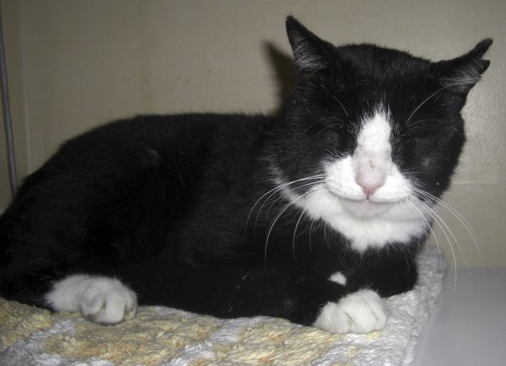 Prektig sort og hvit hann, ukastrert funnet på Ugla. Har sårskader og øye-infeksjon. Rift i venstre øre.
