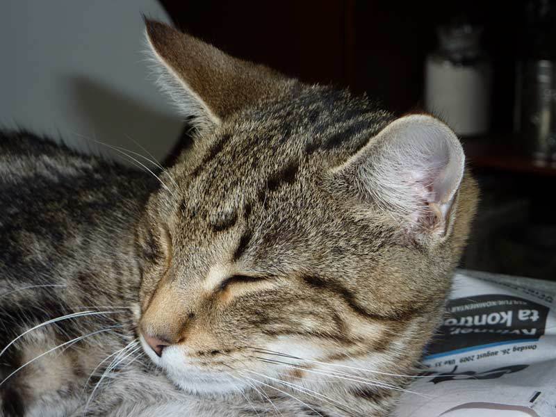 Grå og svart tigerstripet ungkatt. Veldig kjælen og tillitsfull. Glad i mennesker og kos.