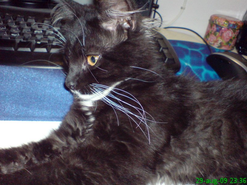 Sort og hvit kattunge. hvit på haka og nedover halsen, på værhårene og på potene. resten sort. Gul-oransje øyne. Ca 3mnd gammel. Tynn.