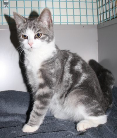 Koselig og kjælen kattunge med korthåret hvit og gråtigret pels. Hun har et særegent ansikt med en liten rosa snute.