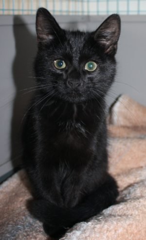 Snill og tillisfull kattunge på 3 måneder. Sort, korthåret pels med litt hvitt i brystet.