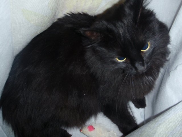 Mio er en sort vakker hunnkatt med veldig lag pels! hun har knall gule øyne og hun er velig glad i mennesker men redd for barn, og høye lyder. hun elsker oppmerksomhet og hun vil helst sove i senga. hun mjauer veldig høyt(hun skriker) hun e dypt savnet og jeg blir kjempe glad om du ringer om du har sett henne!!