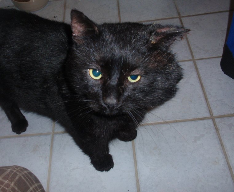 Stor skade i ansiktet. Grønne øyne. Veldig kjælen og tillitsfull. Ca. 1,5-2 år gammel. Ikke merket eller kastrert. Har fått veterinærbehandling for skade i ansikt. Har en "kul" i "hånd"leddet på høyre pote. Ellers ingen kjennetegn.