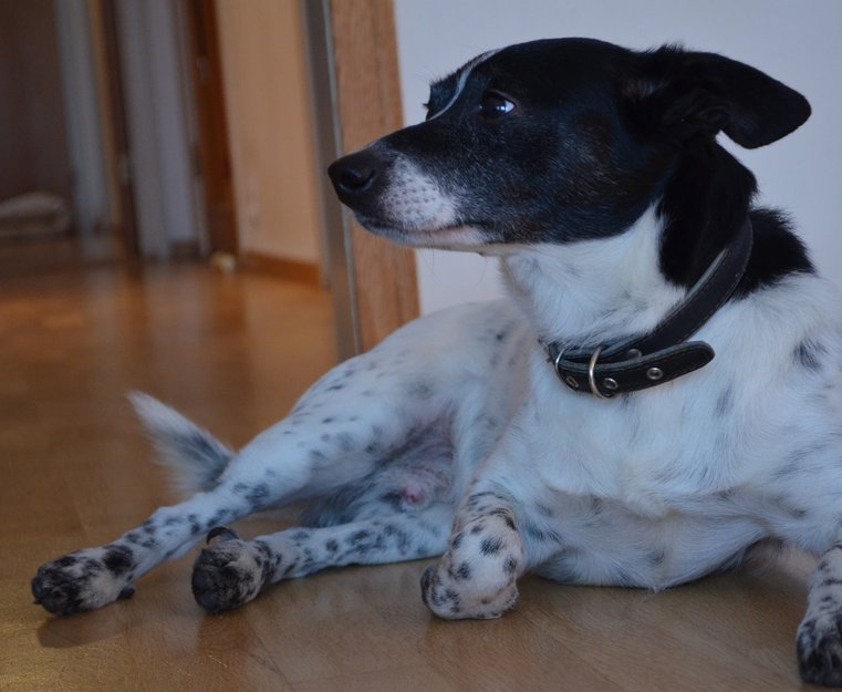 Blanding hunden er knee- høy, hvit, med mange svatre flekker, svart hode.