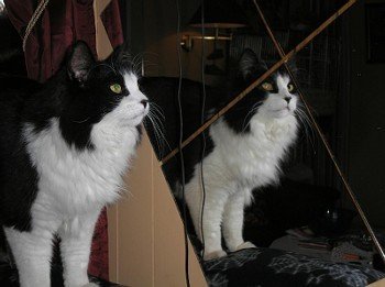 sort og hvit pus med masse pels.han har ett synlig arr på snuta og ett lite hakk i ene øreflippen.