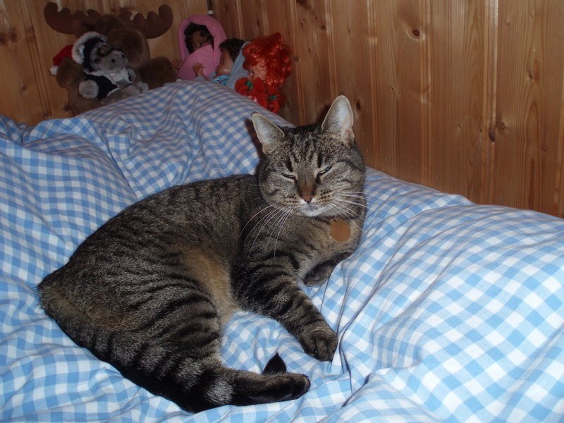 Susi kom plutselig hjem av seg selv, tror vi da. Hun hadde desverre fått båndet sitt under det ene forbenet,så stakkars det hadde gnagd skikkelig. Men nå har vi fått av båndet,så nå ligger hun og koser seg.