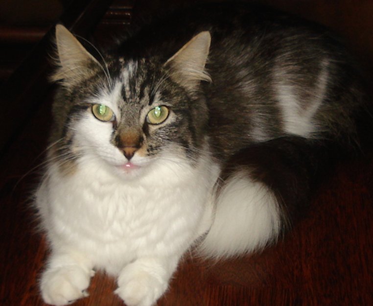 Katten har sort/ grå rygg og hvit mage. Ansiktet er ikke symmetrisk og hun har en sort hale med hvit tupp.