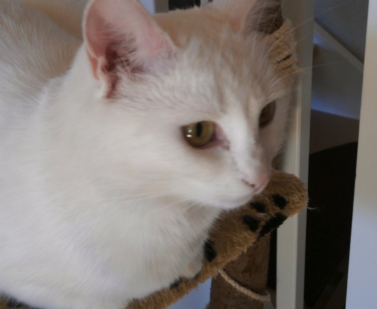 She has golden eyes and can look dirty because she is always rolling around outside, but she has a very soft fur.