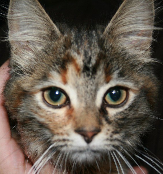 Liten og rolig, men veldig veldig kjælen. Mæler høyt og mye. Katten er ikke øremerket og har ikke halsbånd på seg. En nydelig kattepus som det er lett å bli veldig glad i. Glad i mat. Veldig tålmodig med barn og glad i å ligge i fanget og bli kost med.