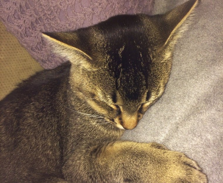 Sarah er 6 mnd og en veldig kosete pus. Hun er grå- og brunspettet i fargen, og har et hvitt lite område under haken. Hun ble sterilisert for tre uker siden, så pelsen under magen er kanskje litt kortere enn resten, selv om Sarah er en korthåret pus. Sarah er chippet.