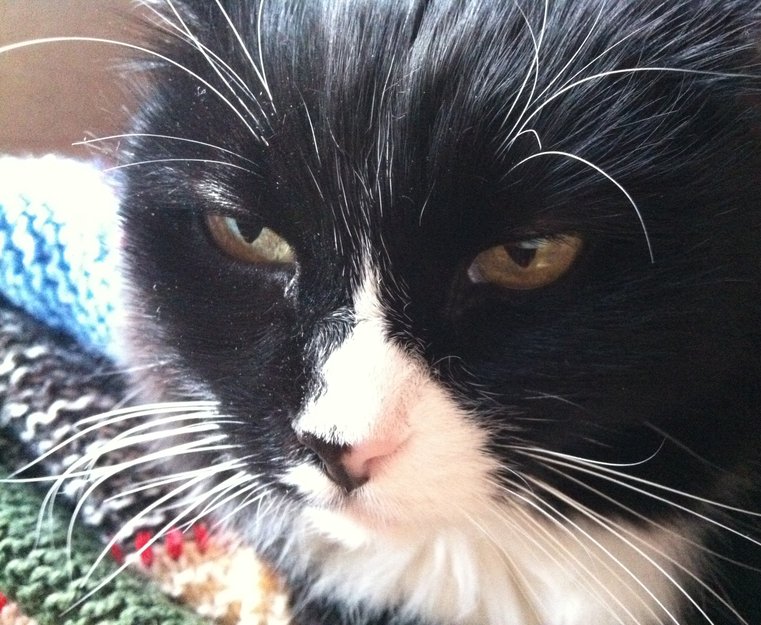 Sort på mesteparten av kroppen, hvite sokker, mage, og hvit haletipp som en rev. Kjælen og litt redd fremmede, barn og brå lyder/bevegelser. Veldig glad i å være hjemme og sove og kose.