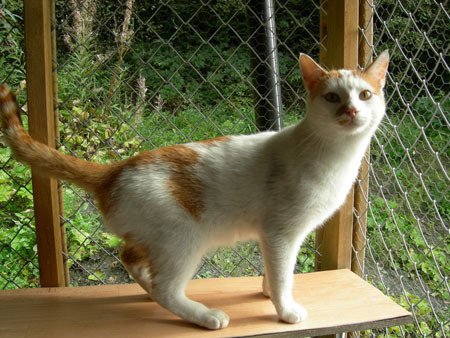 Snill og svært sosial kosegutt med korthåret hvit og rødtigret pels. Sriper på halen, rød flekk ved nesa.