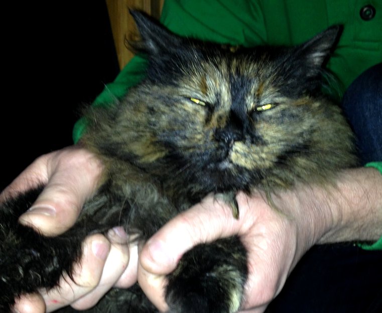 Semilanghåret, mest sannsynlig hukatt. Den er full av tover i pelsen. Katten har hatt tilhold hos de som varslet oss i 1-2 mnd. Vennlig og kontaktsøkende. Ikke merket. Vi ønsker kontakt med eier.