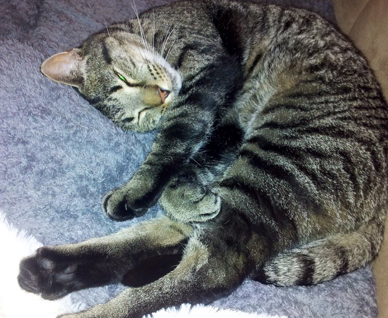 "Makrellmønster" sort og grå med litt beige/brun nyanse. Sort på baksiden av for-og baklabber. Kun hvit under haken. Har et hakk i den ene øretuppen.