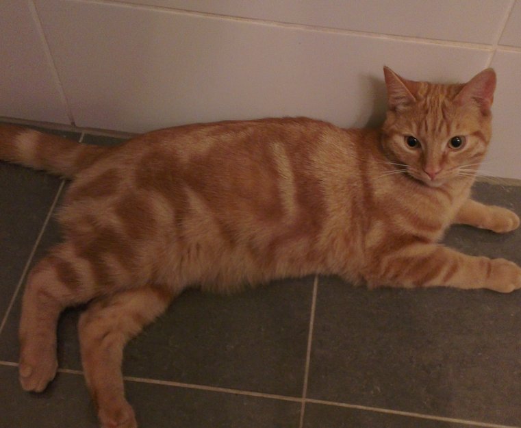 Gjennomført rød katt, ganske skvetten og generelt skeptisk til fremmede. Ruben er øremerket og har chip i nakken.