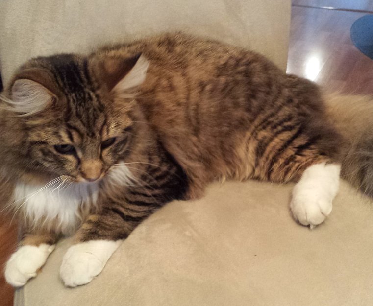 Vi vet ikke hvor han har vært... men tror han ka ha blitt innelukket i en vedbod el.l. Pelsen hadde små klumper av kvae på mage og hale. Ellers var pelsen silkemyk - som før. Han var tynn og svært sulten, men ser ellers ut til å ha det bra.