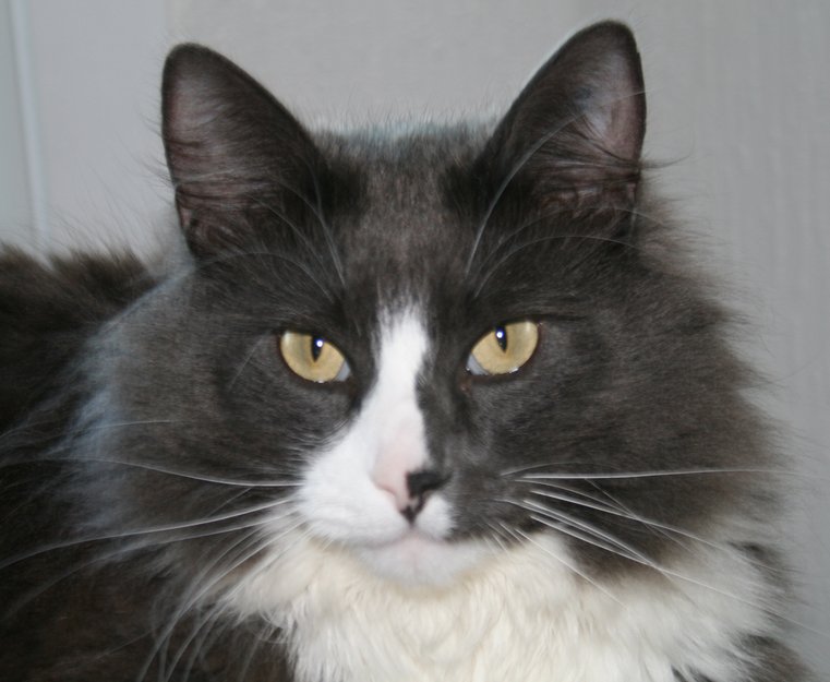 Langhåret grå og hvit hannkatt. Veldig sosial og kosete, og vil sannsynligvis komme bort om man puser på ham. Han er chipmerket med en liten tatovering i øret.