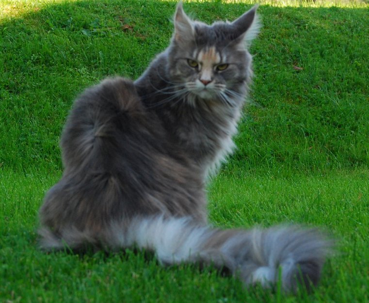 Maine Coon -den STØRSTE katterasen; store ører, lang kropp, lang hale, chip i nakken med C tatovering i øret, ID nummer 578098100248111 . 6 år og ca 6 kg. Primært grå med brunt. Lyder navnet Hermine og er veldig snill.