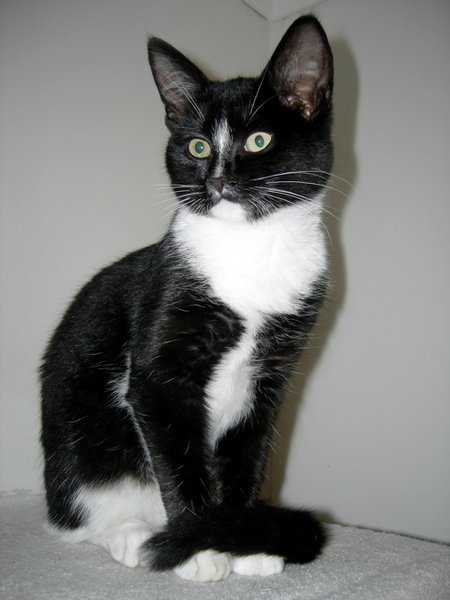 Sort og hvit korthåret ung hunnkatt, lett gjenkjennelig tegning på nesen, tillitsfull og pratsom kattunge