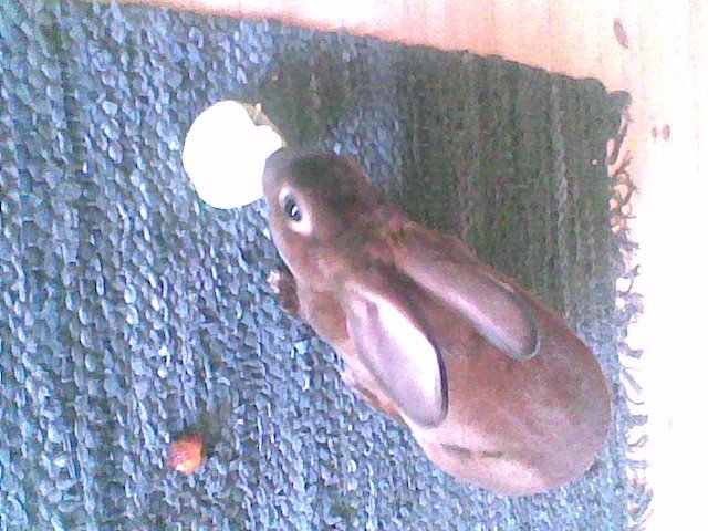 Kanin meg påfallende lange ører og brun pels. Veldig tillitsfull og tam.