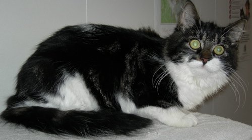 Vakker, snill hunnkatt med langhåret pels, mørk rosa snute. Er litt forsiktig, men svært koselig. Hun har hvit og sort pels med noe grått innimellom.