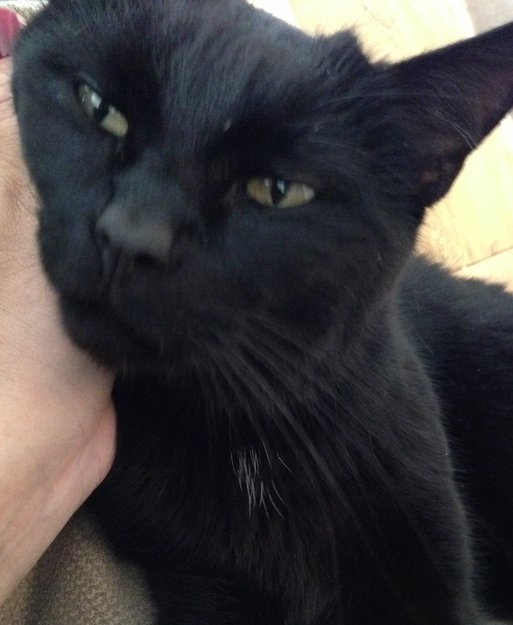Helt svart med bitte bitte litt hvite hår på halsen. Den er liten, tynn, veldig kosete og tilitsfull. Ingen øremerking. Dobbel hudfoll neders ved begge ørene. Blank i pelsen.