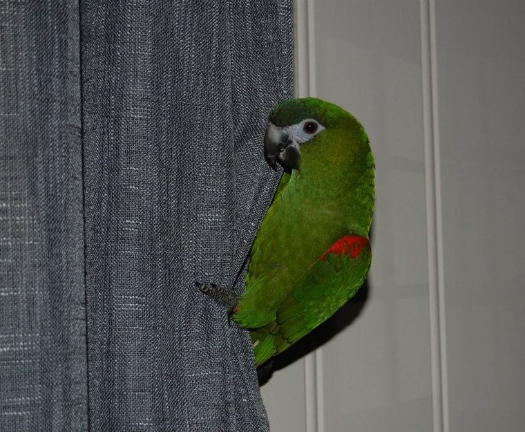 Mario er ca 15-20 cm lang. Grønn med blå panne, og litt rød øverst på vingene.
