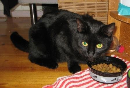 Svart mellomstor katt, vanskelig å si om det er kastrert hankatt eller hunkatt, tillitsfull, virker ung.