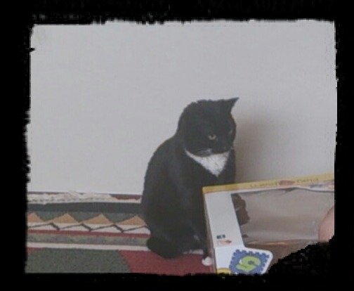 Svart og blank i pelsen. Kvit under magen og kvite "sokker ", pluss en flekk på haken. Tam og feit katt. Veldig kosen og heimkjær.