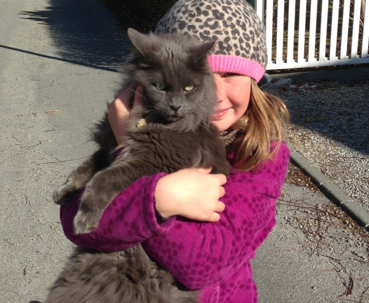 Langhåret, ensfarget grå pels. Grønne øyne. Nysgjerrig og sosial. Lyder navnet Gutte eller pus.
