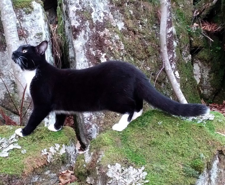 Svart og hvit katt som er lett gjenkjennelig med sin hvite haletupp. Den har også en hvit stripe under haka, hvitt bryst og hvite sokker. Svart snute og hvite værhår.